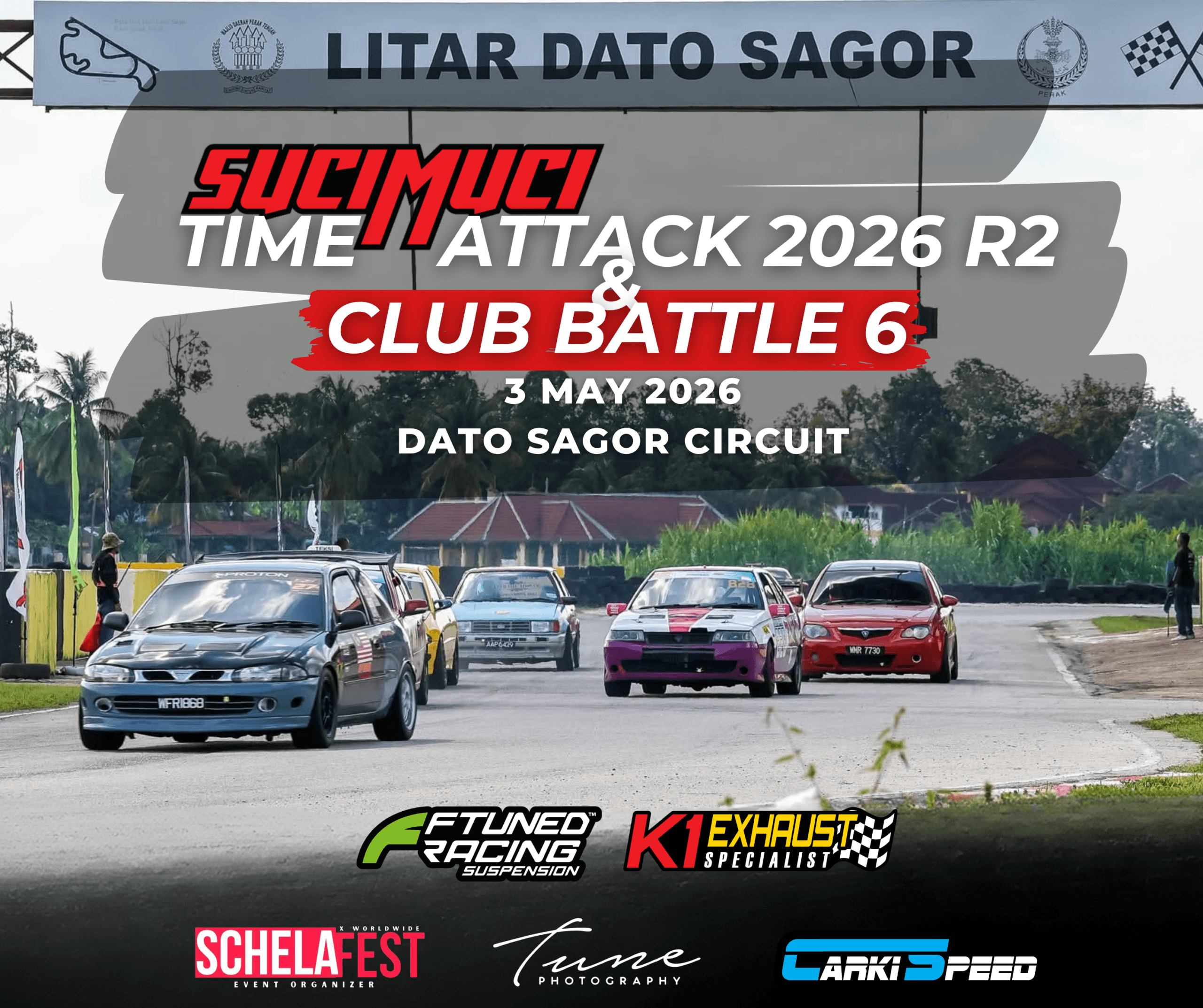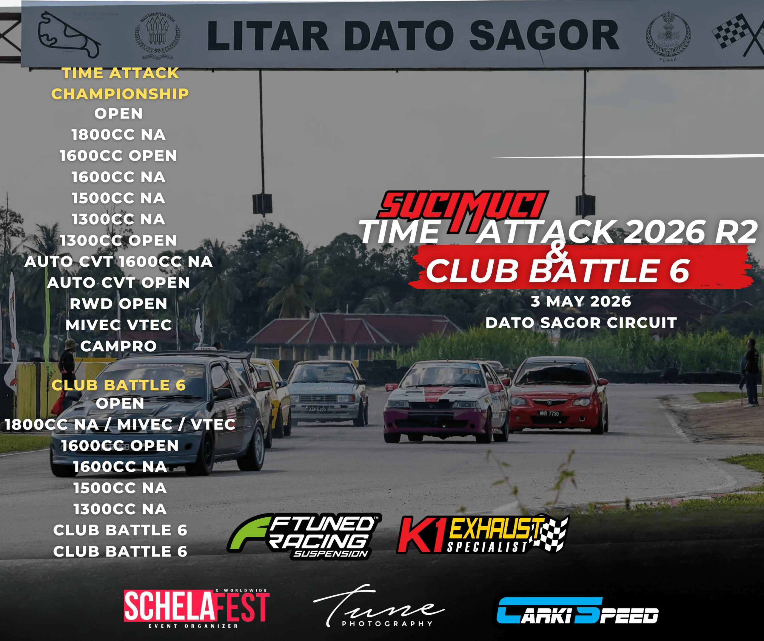 Test & Tune Sucimuci Time Attack 2026 Round 2 & Club Battle 6 akan diadakan pada 3 Mei 2026 di Dato Sagor Circuit, Perak seperti berikut: